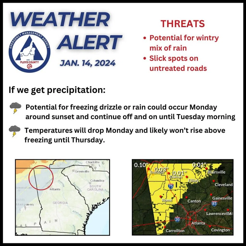 The National Weather Service has issued a Winter Weather Advisory for Floyd, Gordon, Chattooga, Bartow, and Polk Counties from 1 a.m. Monday until 10 a.m. Tuesday.