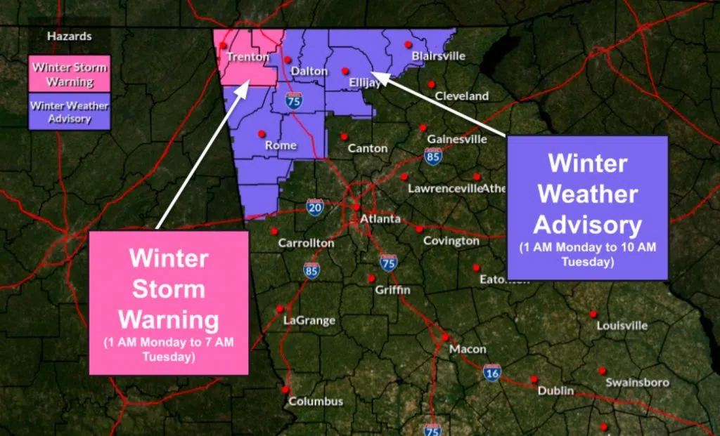 Meanwhile, further north, a Winter Storm Warning has been issued for Dade, Walker, Whitfield, and Catoosa Counties, also from 1 a.m. Monday until 7 a.m. Tuesday.
