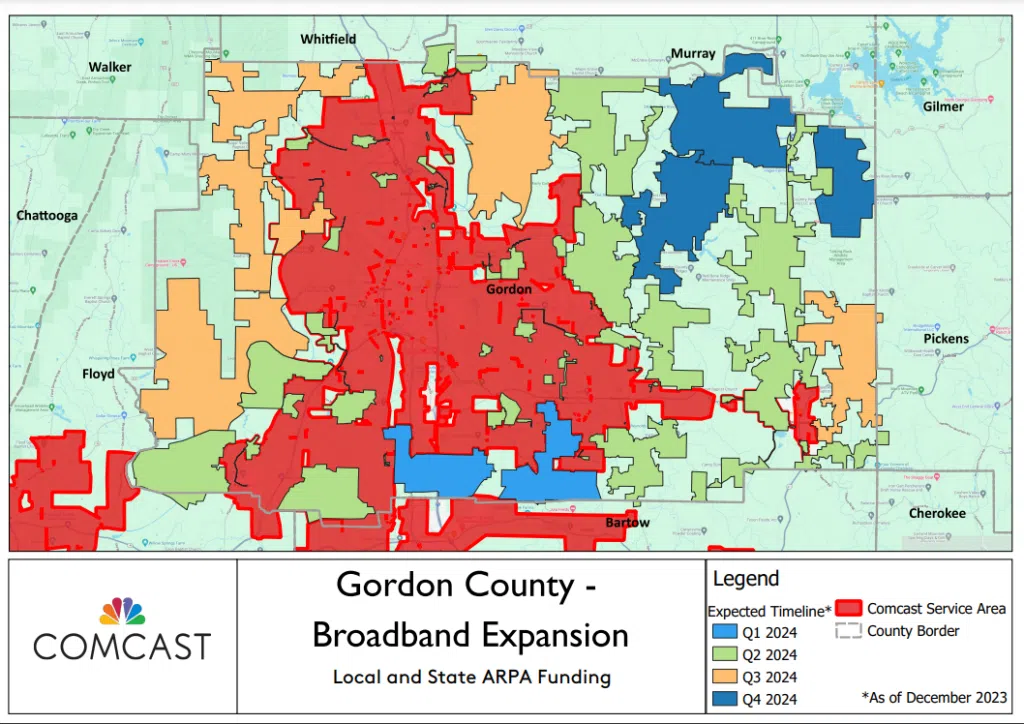 Comcast is working to bring its network to more than 5,000 homes and businesses in Gordon County, Georgia, by the end of this year. This expansion project was funded by contributions from the state of Georgia, Gordon County, and Comcast.