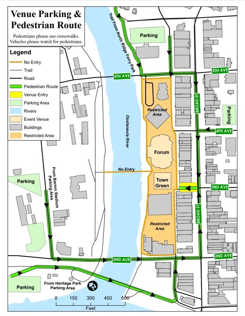 Entry to the event is via pedestrian traffic only and begins at 1 pm; the main event begins at 5 pm. All attendees will enter from Broad Street through Mitchell Plaza (3rd Avenue at Broad Street) and will be screened prior to entry into the Town Green and Forum River Center.