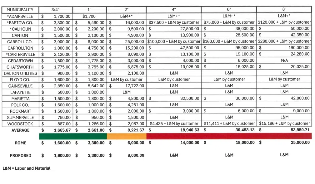 The fee schedule gets a little more complicated when considering the larger lines. Currently, the fee is $14,000 for a four-inch line, $18,000 for a six-inch line, and $25,000 for eight-inch lines. The results of the study showed a wide variety of costs. Some communities just charge for labor and materials, while others charge a fee, plus labor and materials all paid for by the customer. In Carroll County, that fee is $280,000 for an eight-inch line. Boyd is recommending that Rome have no fee with the customer paying for labor and materials.