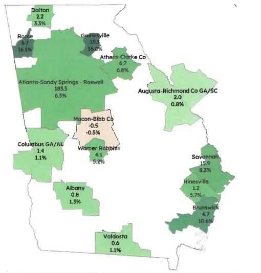 Metro Atlanta was fifth at 6.3 percent, followed by Hinesville at 5.7 percent, and Warner Robins at 5.2 percent.