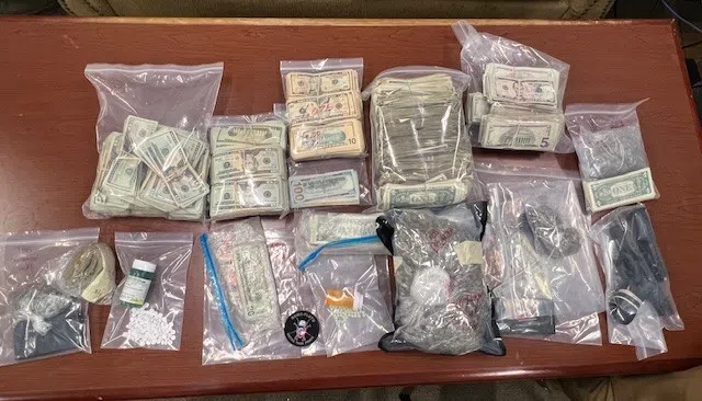 1.4 pounds of marijuana, digital scales, 100 Oxycodone tablets, 56 fentanyl tablets, one firearm, and over $60,000 were seized.