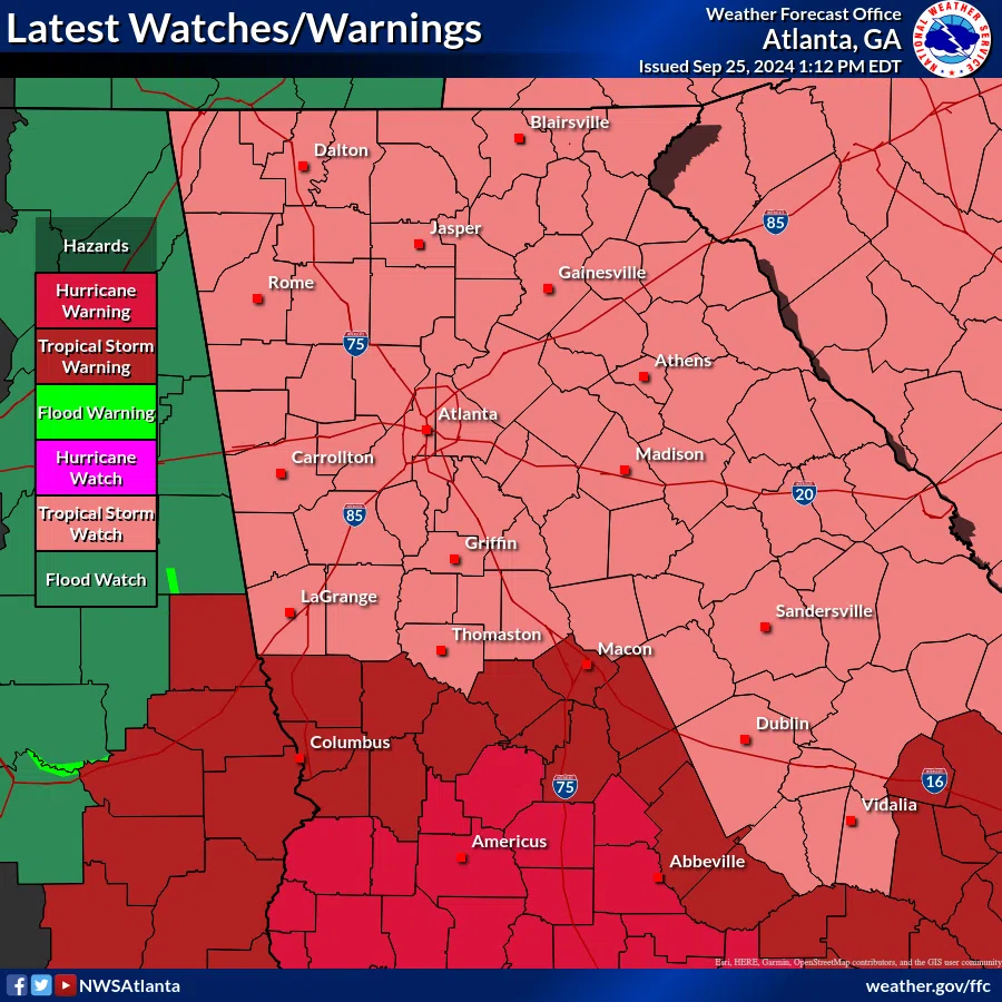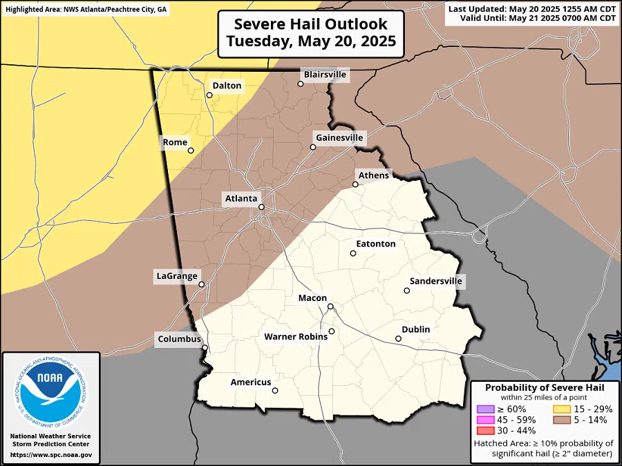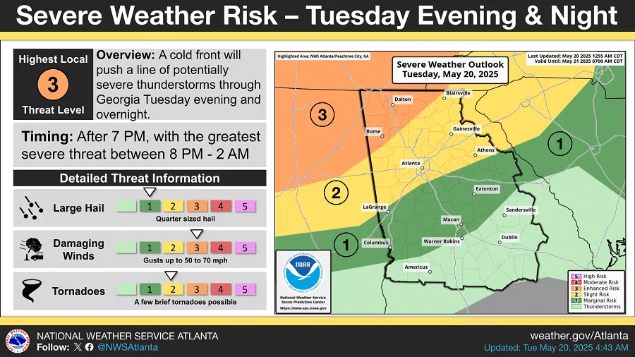 - The peak severe threat is expected in far north and northwest (north of I-85) Georgia between 8 PM tonight and 2 AM Wednesday morning.