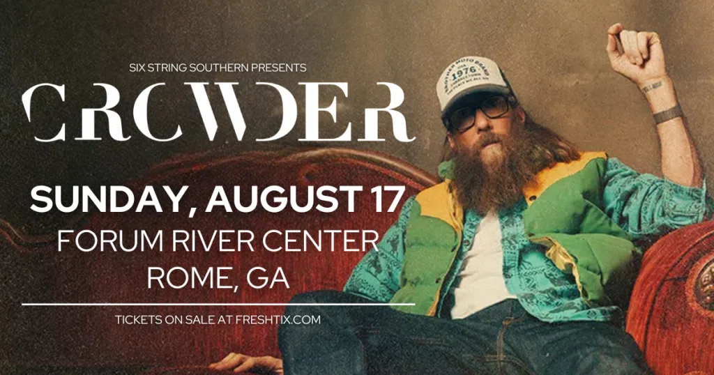 Six String Southern Productions and the Forum River Center are pleased to announce Crowder will perform live at the Forum River Center on Sunday, August 17, 2025. Tickets go on sale to the public on Wednesday, June 11 at 10 AM at Freshtix.com or by phone at 678-701-6114.
