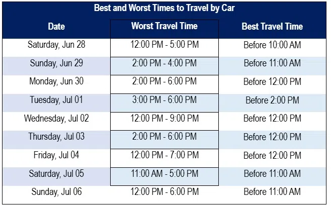 According to INRIX, expect heavy road congestion on Wednesday, July 2 and Sunday, July 6. The busiest times will be afternoons, while mornings offer the best escape from traffic.