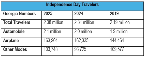 • Other Modes: Nearly 104,000 Georgians will take buses, trains, or cruises (+7,000, up 7% from last year).