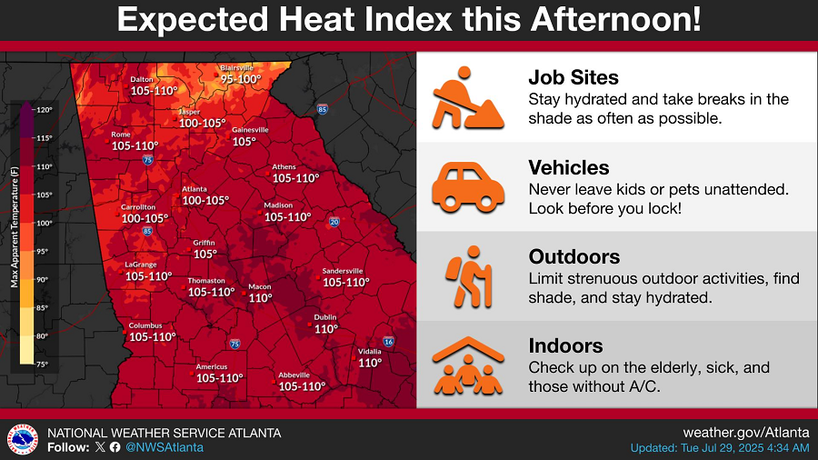 You can expect heat index values up to 108 in portions of central, east central, north central, northeast, northwest, and west central Georgia.
