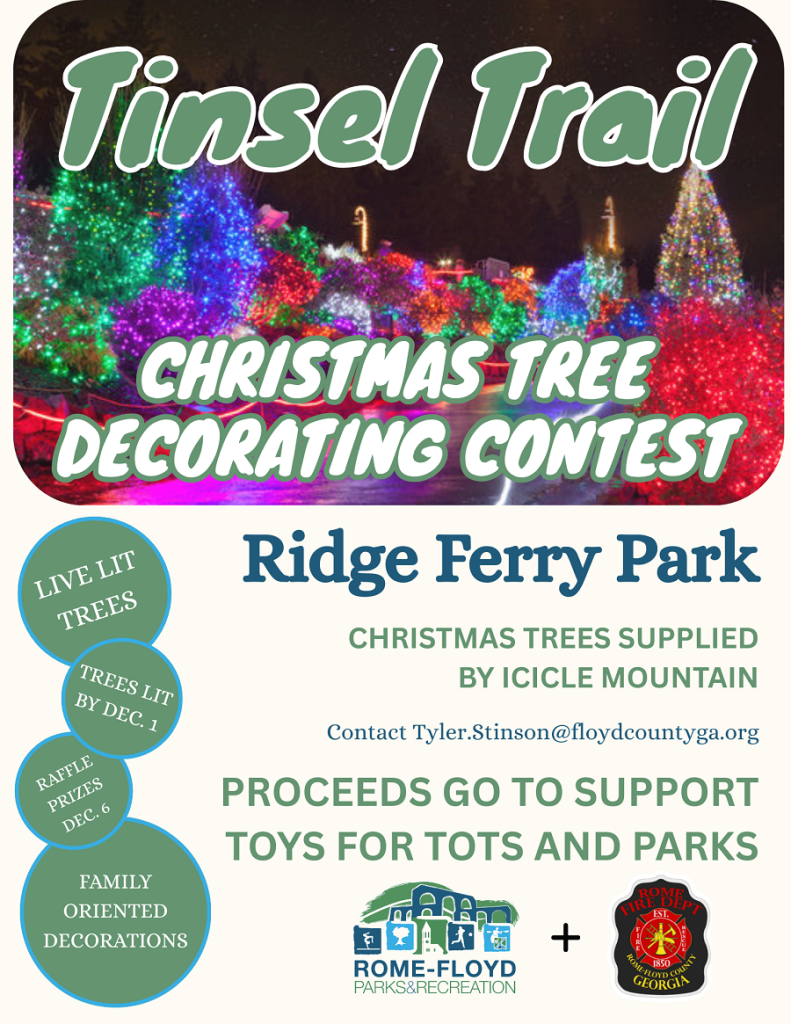Rome-Floyd Parks and Recreation is excited to announce our newest event, Tinsel Trail. It is a holiday event where businesses, families, and community groups can purchase and decorate their own Christmas tree at Ridge Ferry Park.