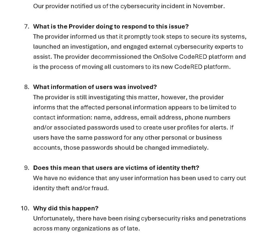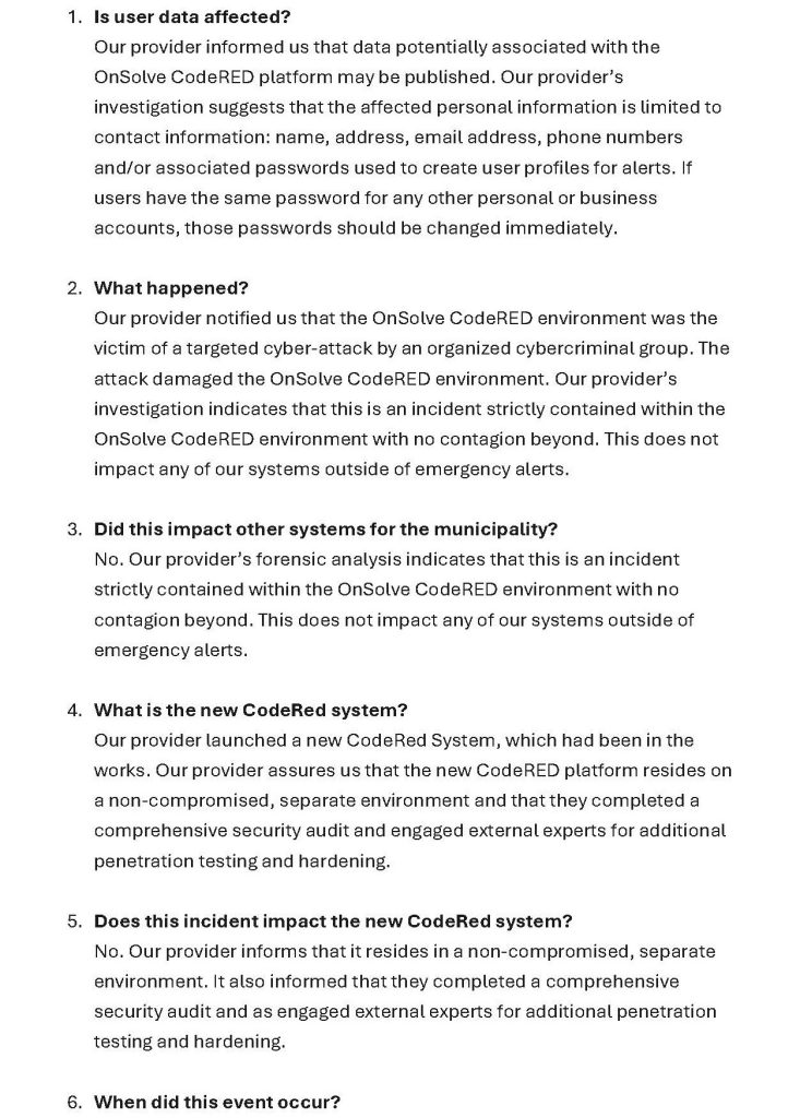 Data affected by the attack was limited to contact information of CodeRED users, including: name, address, email address, phone numbers, and/or associated passwords used to create user profiles for alerts.