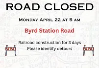 Monday, April 22, 2024–10:04 a.m.-Floyd County News Release-Byrd Station Road will begin a closure on Monday at 5 am for 3 days to complete railroad improvements.The crossing will be closed to a...